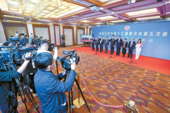 昨天,市政協(xié)十三屆五次會(huì)議舉辦“我是委員”集體采訪。8名委員在現(xiàn)場,1名委員通過視頻圍繞“冬奧有我”“科創(chuàng)中心建設(shè)”“履職為民”三個(gè)主題回答記者提問。 本報(bào)記者 方非攝