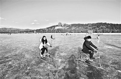 頤和園冰場的景色絕佳,冰場四周環(huán)繞著頤和園的亭臺樓閣,游客在冰面滑行的過程中,可切身感受到古人造園“步移景異”的精妙之處。冰上賞景的最佳選擇是騎行冰上自行車,冰上自行車幾乎對技術(shù)零要求,因?yàn)橛薪饘倏蚣艿闹?,騎行時(shí)比普通自行車還要平穩(wěn),冰上自行車可快可慢、可停可站,游客呼吸著清冽的空氣,眼前則是高大雄偉的佛香閣與遼闊的西山群峰,盡管腳下在奮力地蹬車,在不知不覺間已融入到頤和園的山水畫卷之中。