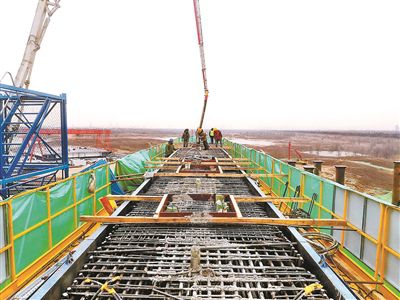 本報(bào)訊(記者 劉洋)1月12日,京雄高速公路(北京段)全線重點(diǎn)控制性工程永定河特大橋再傳捷報(bào),經(jīng)過(guò)16個(gè)小時(shí)的晝夜作戰(zhàn),作為京雄高速公路全線最大蓋梁的永定河特大橋西引橋20#墩蓋梁順利澆筑完成,這標(biāo)志著永定河特大橋的上部結(jié)構(gòu)施工帷幕業(yè)已拉開(kāi)。