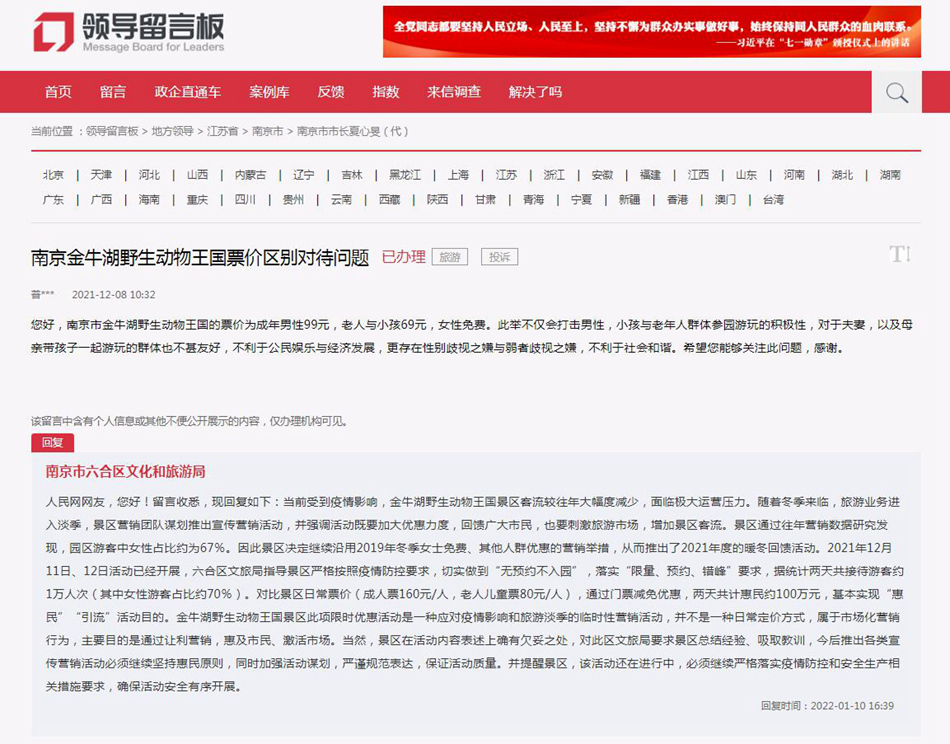 2021年12月8日,網(wǎng)友在人民網(wǎng)“領(lǐng)導(dǎo)留言板”向南京市市長(zhǎng)留言稱(chēng),南京市金牛湖野生動(dòng)物王國(guó)的票價(jià)為成年男性99元,老人與小孩69元,女性免費(fèi)。此舉不僅打擊男性、小孩與老年人參園游玩的積極性,而且對(duì)于夫妻以及母親帶孩子一起游玩的群體也不甚友好,不利于公民娛樂(lè)與經(jīng)濟(jì)發(fā)展,另外更存在性別歧視與弱者歧視之嫌,不利于社會(huì)和諧。