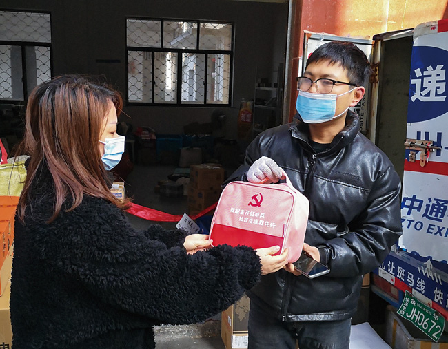 1月12日,金華開發(fā)區(qū)江南街道金錢寺社區(qū)給快遞小哥贈送裝有口罩、酒精、消毒液等物資的“防疫禮包”,讓快遞小哥做好自身防護(hù)。(時(shí)寬兵)