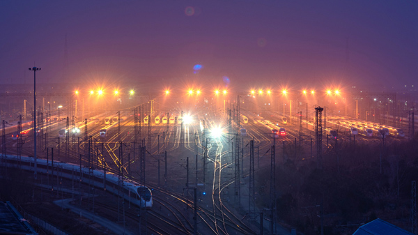 凌晨,一列動(dòng)車(chē)組列車(chē)駛出上海虹橋動(dòng)車(chē)運(yùn)用所。上海鐵路部門(mén)供圖