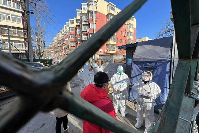 1月25日早8點(diǎn),室外氣溫低于零度,而今日的大風(fēng)天氣更降低了體感溫度。在小區(qū)門口,街道和社區(qū)的“大白”們?cè)缫丫臀唬诠芸貐^(qū)外值守并隨時(shí)準(zhǔn)備為身體不便的居民進(jìn)行入戶核酸檢測(cè)工作。