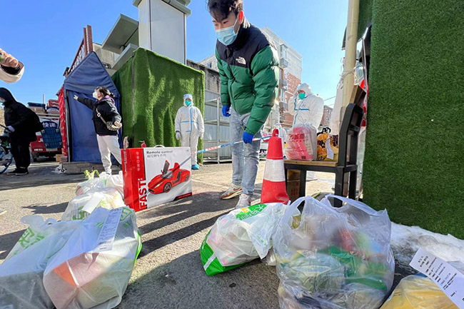 為保障居民買菜用餐等正常生活,院內(nèi)居民可以通過外賣快遞采購(gòu)物資,也可以通過社區(qū)代為采購(gòu)。封控區(qū)居民通過快遞外賣的購(gòu)買物品,會(huì)在消殺后,由工作人員送至門口。對(duì)不會(huì)使用網(wǎng)絡(luò)購(gòu)物的居民,社區(qū)提供了配餐和送貨上門服務(wù)。