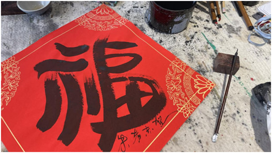 現(xiàn)場(chǎng),朱者赤還即興提筆,墨躍紅紙,以倒序筆畫(huà)寫(xiě)下福字,以此寄予“福到了”的新年祝福。作為入駐林家藝術(shù)村的第一批自由職業(yè)藝術(shù)家,朱者赤認(rèn)為,鄉(xiāng)村的自然恬淡能為藝術(shù)家的創(chuàng)作帶來(lái)許多靈感,而藝術(shù)賦能也會(huì)對(duì)美麗鄉(xiāng)村建設(shè)會(huì)起到推進(jìn)作用,他希望自己能在其中發(fā)揮作用,在不斷創(chuàng)作創(chuàng)新的同時(shí),讓更多藝術(shù)美走進(jìn)鄉(xiāng)村中去。