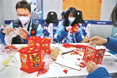 昨天是中國的傳統(tǒng)節(jié)日元宵佳節(jié),國家體育館開展了豐富多彩的慶?;顒樱?dāng)天場館餐廳提供了湯圓,場館禮賓部工作人員向外賓介紹中國吃湯圓的由來和寓意,并邀請大家品嘗。在志愿者之家內(nèi),彩燈高懸,充滿歡聲笑語,志愿者們做燈籠、猜燈謎,共同度過一個歡樂祥和的元宵節(jié)。圖為冬奧志愿者在制作花燈。文并攝/本報記者 黑建軍