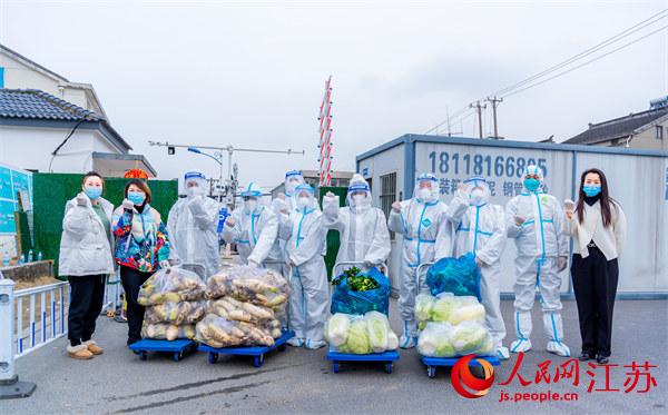 蘇州吳中區(qū)木瀆鎮(zhèn)愛心人士嚴(yán)麗萍(右一)等為管控區(qū)送上愛心蔬菜。木瀆鎮(zhèn)供圖