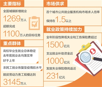 看主要指標(biāo),全國(guó)城鎮(zhèn)新增就業(yè)1269萬(wàn)人,超額完成1100萬(wàn)人的目標(biāo)任務(wù);全年全國(guó)城鎮(zhèn)調(diào)查失業(yè)率平均值為5.1%,比上年平均值下降0.5個(gè)百分點(diǎn),就業(yè)目標(biāo)任務(wù)圓滿(mǎn)完成。
