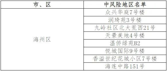 通告稱,根據國務院聯(lián)防聯(lián)控機制有關規(guī)定,經綜合評估研判,市指揮部決定,自2022年3月6日0時起,將眾興華庭7號樓、潤琦苑3號樓、九嶺社區(qū)北大荒西21號、天景美地4號樓、溫僑綠苑B2、悅城國際9號樓、香溢世紀花城小區(qū)7號樓、海連中路151號調整為中風險地區(qū),其他地區(qū)風險等級不變。