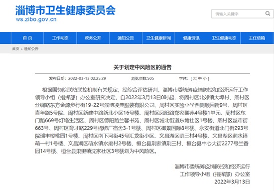 人民網(wǎng)淄博3月13日電(鄭浦麗)據(jù)淄博市衛(wèi)生健康委員會官網(wǎng)消息,根據(jù)國務(wù)院聯(lián)防聯(lián)控機(jī)制有關(guān)規(guī)定,經(jīng)綜合評估研判,淄博市委統(tǒng)籌疫情防控和經(jīng)濟(jì)運(yùn)行工作領(lǐng)導(dǎo)小組(指揮部)辦公室研究決定,自2022年3月13日0時(shí)起,將周村區(qū)北郊鎮(zhèn)大埠村、周村區(qū)絲綢路東方金源步行街19-22號淄博凌典服裝有限公司、周村區(qū)實(shí)驗(yàn)小學(xué)西側(cè)順園街9號、周村區(qū)青年路5號院、周村區(qū)新建中路新北小區(qū)16號樓、周村區(qū)鳳陽路鄭家馨苑4號樓1單元、周村區(qū)東門路669號燈塔生活區(qū)、周村區(qū)德陽路蘭馨書苑、周村區(qū)城北街道東塘社區(qū)1號樓、周村區(qū)絲市街663號、周村區(qū)育才路229號棉紡廠宿舍3-1號樓、周村區(qū)御景國際8號樓、永安街道北門街293號院瑞豐櫻桃園1號樓、周村區(qū)南下河街45號匯龍街小區(qū)、文昌湖區(qū)萌三村4號樓、文昌湖區(qū)萌水鎮(zhèn)萌一村1號樓、文昌湖區(qū)萌水鎮(zhèn)水磨村2號樓、桓臺縣荊家鎮(zhèn)荊三村、桓臺縣中心大街2277號蘭香園14號樓、桓臺縣果里鎮(zhèn)沈家社區(qū)3號樓劃為中風(fēng)險(xiǎn)區(qū)。