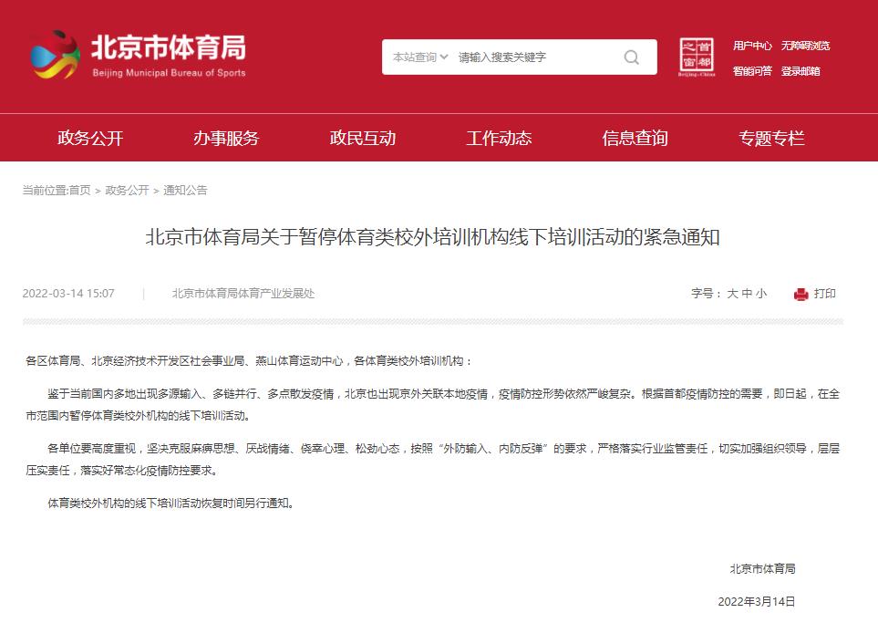 北京:全市范圍內(nèi)暫停體育類校外機構的線下培訓活動