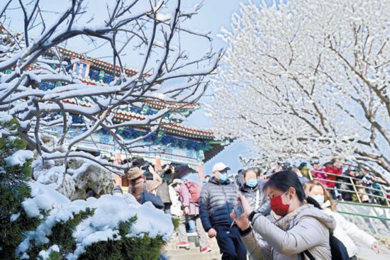 在其他市屬公園,昨天一早亦是同樣盛景——北海公園內(nèi),花雪簇簇映白塔;香山公園內(nèi),蠟梅傲雪更沁香;景山公園內(nèi),飛雪春花映紅墻……春花與雪相遇在園林古建中,共同構(gòu)建出詩情畫意的三月北京獨(dú)特春景。