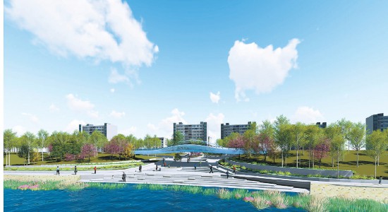 這將是一條生機盎然的自然河流。沒有水泥堤岸,而是通過軟化駁岸和綠化護坡形成生態(tài)岸線。河道內外遍植水生植物和彩葉樹,花草灌木散落水岸之間。河堤外地勢低洼,林下將因形就勢開辟充滿野趣的雨水花園,讓洶涌雨水可以駐留以削減洪峰,并能夠自然下滲,滋潤萬物。