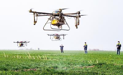 3月19日,石家莊市溫德格信農(nóng)業(yè)科技有限公司工作人員在石家莊市欒城區(qū)南高鄉(xiāng)魯家莊村麥田里使用無人植保機作業(yè)。河北日報通訊員 李明發(fā)攝