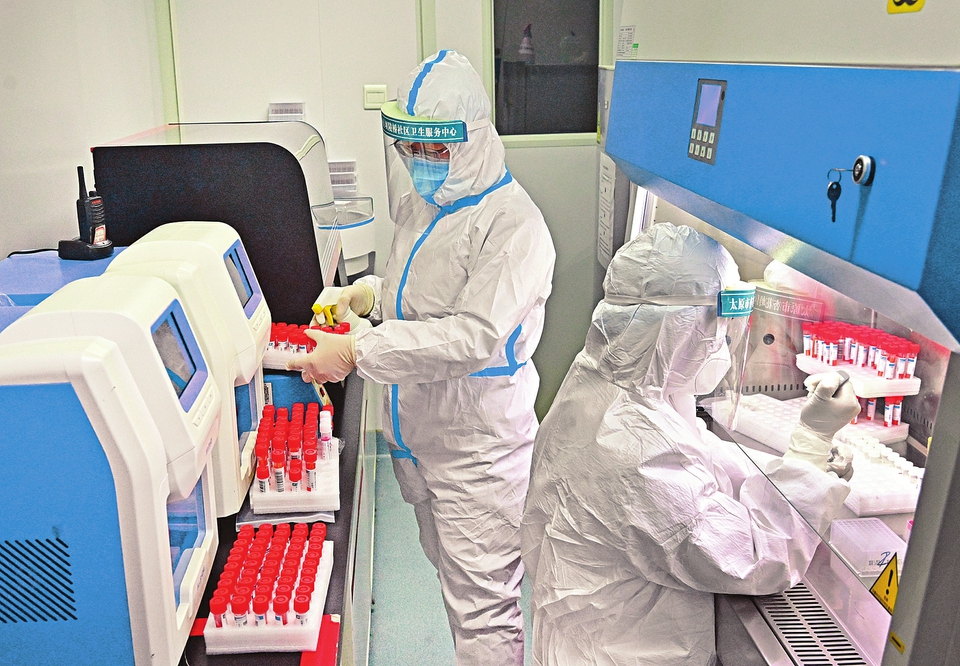 在太原市杏花嶺區(qū)壩陵橋社區(qū)衛(wèi)生服務(wù)中心PCR室,醫(yī)務(wù)人員正在對采集樣本進行新型冠狀病毒核酸檢測。 記者劉通攝