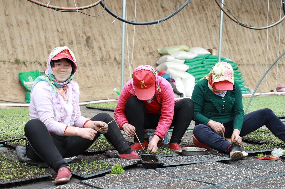 “這是剛長成的辣椒苗,我們抓緊時間把它們移植到育苗盤里,一坑兒一苗兒。”正在熟練做工的56歲村民薛愛說,“節(jié)令不等人,從3月初開始張羅營養(yǎng)土配比,然后播種、澆水、移植和管護,到5月中旬進入銷售高峰,我們就一直在這里忙?!?/p>