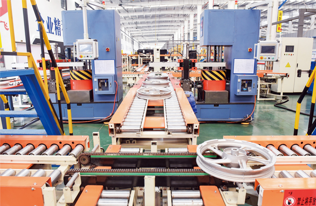 3月30日,在位于金華婺城區(qū)摩輪未來(lái)工廠生產(chǎn)車(chē)間里,智能生產(chǎn)線(xiàn)正在平穩(wěn)運(yùn)行,全自動(dòng)完成設(shè)定的輪轂加工工序。該工廠被金華市和婺城區(qū)列為數(shù)字化示范企業(yè)。企業(yè)運(yùn)用5G、視覺(jué)識(shí)別等新一代信息技術(shù),大量應(yīng)用工業(yè)機(jī)器人,實(shí)現(xiàn)柔性化生產(chǎn),建成裝備數(shù)字化、工藝數(shù)字化、運(yùn)營(yíng)數(shù)字化的數(shù)字化工廠。用工人數(shù)比傳統(tǒng)項(xiàng)目減少58%,生產(chǎn)效率提升15%。(陳俊、李建林)