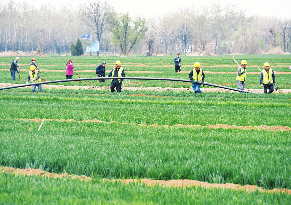 4月2日,在翼城縣南梁鎮(zhèn)梁壁村高標(biāo)準(zhǔn)建設(shè)農(nóng)業(yè)生產(chǎn)基地,技術(shù)人員在安裝節(jié)水管道。該基地著力在“高效節(jié)水”上蹚出一條新路徑,通過智能管灌、智能噴灌、智能滴灌三項(xiàng)高效節(jié)水措施,為農(nóng)業(yè)灌溉充分利用地表水、合理使用淺層水、嚴(yán)控地下水提供先例打好基礎(chǔ),確保糧食豐產(chǎn)增收。(閆銳鵬攝)