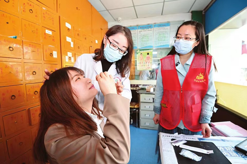 4月6日,太原市迎澤區(qū)老軍營社區(qū)衛(wèi)生服務站內,老軍營二社區(qū)工作人員和衛(wèi)生服務站的醫(yī)護人員在學習使用新冠抗原檢測試劑,掌握使用方法和檢測結果確認方式。當日,老軍營二社區(qū)與社區(qū)衛(wèi)生服務站聯合引入新冠抗原檢測試劑,組織工作人員學習使用,以便試劑下發(fā)居民之后快速教授居民使用方法。(記者阮洋攝)