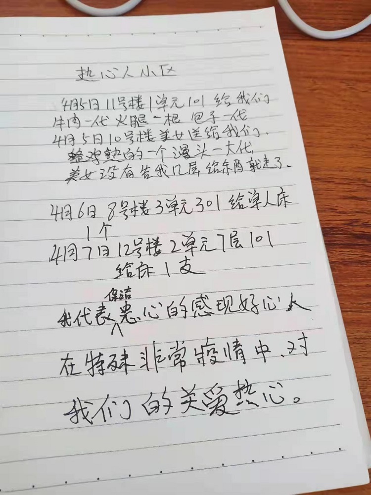 “4月5日,11號樓1單元101,給我們牛肉一袋,火腿一根,包子一袋;4月5日,10號樓送來整雞一個,饅頭一大袋,但是沒有留下具體門牌就走了;4月6日,8號樓3單元301給單人床一個;4月7日,12號樓2單元7層101給床一個。我代表保潔衷心地感謝好心人,在非常時期,對我們的關愛。”