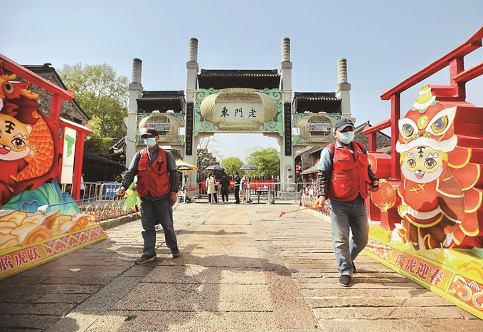為保障旅游市場(chǎng)有序、游客健康平安,南京老門東景區(qū)嚴(yán)抓疫情防控。圖為昨日早晨,景區(qū)工作人員在對(duì)公共場(chǎng)所進(jìn)行消殺,為游客到來做好準(zhǔn)備。 本報(bào)記者 范俊彥 攝