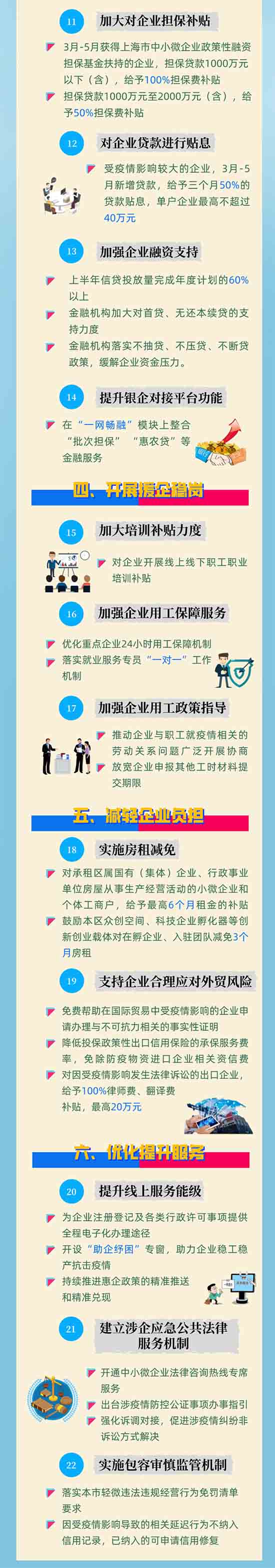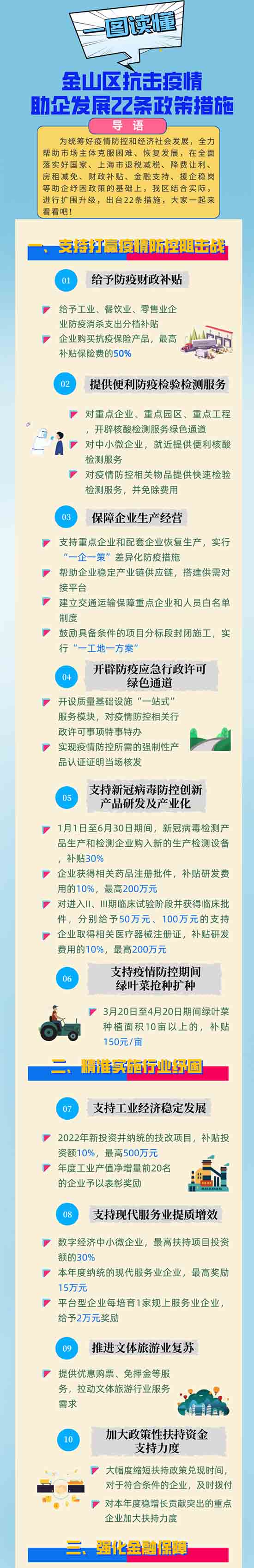 據(jù)悉,為統(tǒng)籌好疫情防控和經(jīng)濟(jì)社會(huì)發(fā)展,全力幫助市場(chǎng)主體克服困難、恢復(fù)發(fā)展,在全面落實(shí)好國(guó)家、上海市退稅減稅、降費(fèi)讓利、房租減免、財(cái)政補(bǔ)貼、金融支持、援企穩(wěn)崗等助企紓困政策的基礎(chǔ)上,結(jié)合金山實(shí)際,進(jìn)行擴(kuò)圍升級(jí),制訂《金山區(qū)抗擊疫情助企發(fā)展22條政策措施》?!?2條”既聚焦企業(yè)當(dāng)前面臨的“難點(diǎn)”“痛點(diǎn)”“堵點(diǎn)”,又考慮到疫情后企業(yè)加快發(fā)展的各項(xiàng)訴求,共計(jì)包括六大方面內(nèi)容,即支持打贏疫情防控阻擊戰(zhàn)、精準(zhǔn)實(shí)施行業(yè)紓困、強(qiáng)化金融保障、開(kāi)展援企穩(wěn)崗、減輕企業(yè)負(fù)擔(dān)及優(yōu)化提升服務(wù),用實(shí)實(shí)在在的舉措,精準(zhǔn)幫助市場(chǎng)主體紓困解難,穩(wěn)定經(jīng)濟(jì)增長(zhǎng)。