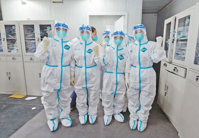 4月8日晚,隨著海南省援滬醫(yī)療隊近百名醫(yī)護(hù)人員的進(jìn)駐,上海嘉定南翔方艙醫(yī)院正式投入運(yùn)行。圖為醫(yī)護(hù)人員在入艙前加油鼓勁。新華社記者 李 賀攝