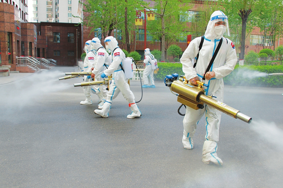 4月12日,在小店區(qū)千禧學府苑小區(qū),太原市應(yīng)急管理綜合行政執(zhí)法支隊的消殺隊員們正在消殺。隨后他們來到西吳村社區(qū)、丁香園、恒大綠洲、長風小區(qū)等居民住宅區(qū),對所有樓棟、垃圾點及室外公共區(qū)域等進行全面消殺,牢牢筑起健康防線。(記者尤麗云攝)
