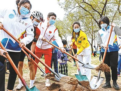 此次活動由國家體育總局冬運(yùn)中心與北京市石景山區(qū)共同舉辦,是“冰雪向未來”全國群眾性冰雪主題活動的第一站,也是北京冬奧會后冰雪項(xiàng)目國家隊(duì)公益服務(wù)計(jì)劃的首場活動。圖為昨日,北京冬奧會冠軍武大靖(左三)在北京冬奧公園內(nèi)的“中國冰雪冠軍林”植樹。