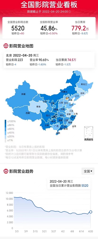 據(jù)國(guó)內(nèi)某專(zhuān)業(yè)電影數(shù)據(jù)平臺(tái),4月20日全國(guó)影院營(yíng)業(yè)率45.86%,營(yíng)業(yè)影院5520家,較上日增加60家,大盤(pán)票房779.2萬(wàn)元。截至4月20日23時(shí),浙江省單日票房(4月20日)約為64萬(wàn)元,總出票17678張,總場(chǎng)次13722場(chǎng),平均票價(jià)36元。