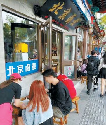 以什剎海游覽區(qū)東北角為例,沿街的小吃窗口相對密集,這些窗口附近正好是長長的臺階。從下午到傍晚,游客們像走進了階梯教室一樣,人擠人、人挨人地坐到了臺階上,烤串、爆肚、熟食席地擺放,用餐人員的密集程度比堂食還要高。