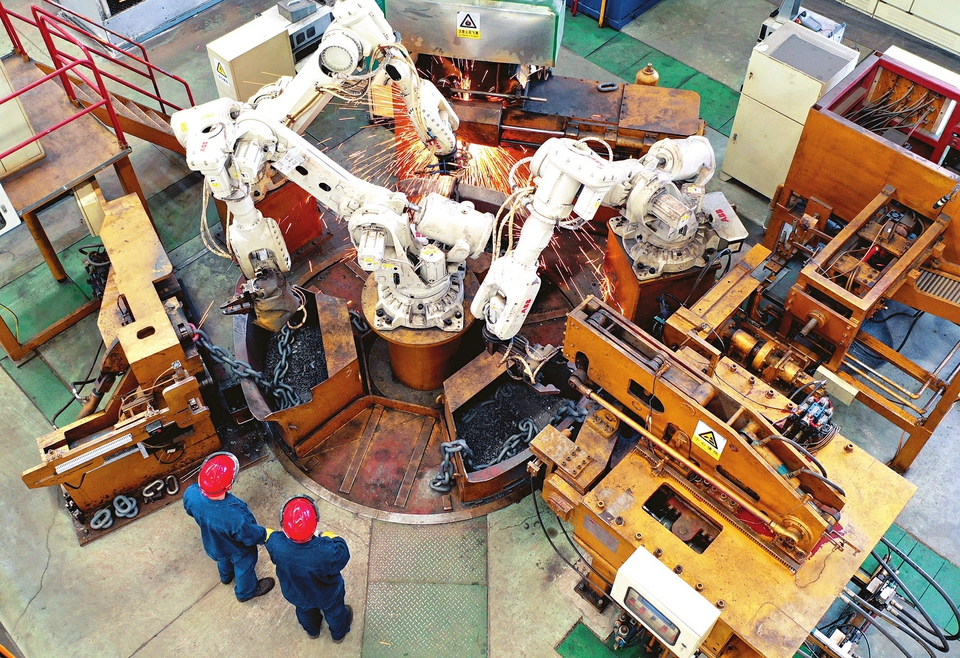 5月5日,在晉能控股裝備制造集團(tuán)華越華茂公司生產(chǎn)車間,國(guó)內(nèi)首套國(guó)產(chǎn)化礦用高強(qiáng)度圓環(huán)鏈全自動(dòng)制鏈機(jī)組正在作業(yè)中。近年來,該公司不斷提升裝備能力,其生產(chǎn)的礦用高強(qiáng)度圓環(huán)鏈、緊湊鏈及各類工業(yè)用鏈條,工藝達(dá)到國(guó)內(nèi)領(lǐng)先水平。(記者劉通攝)