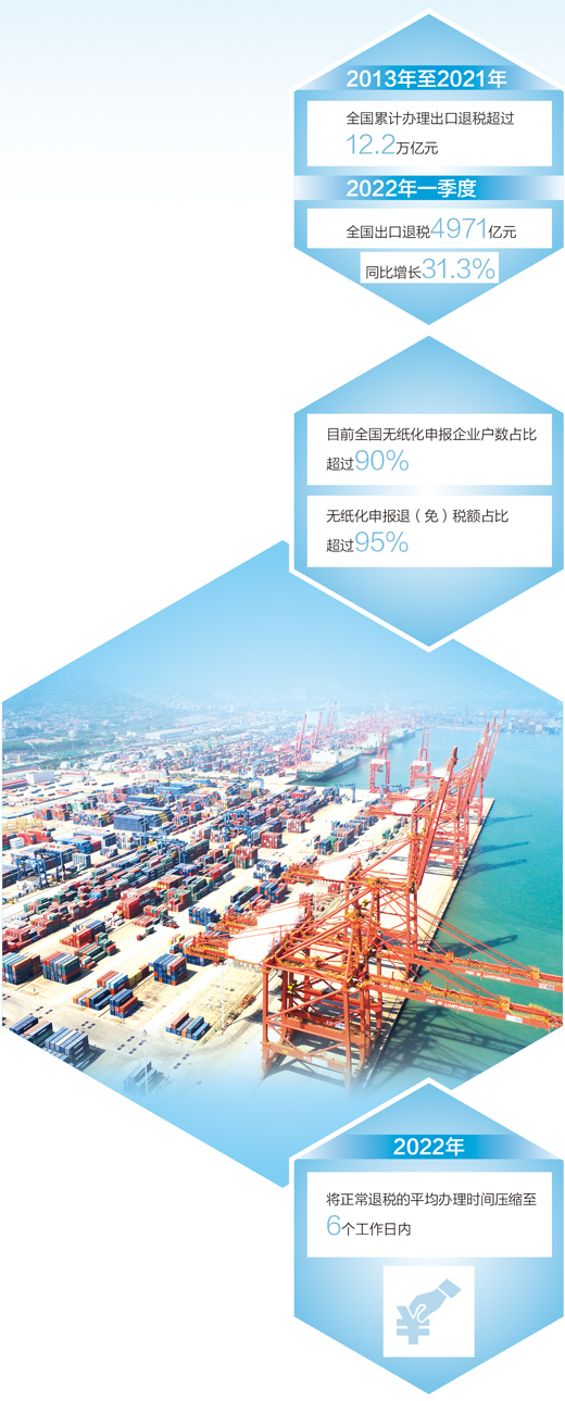 資金是企業(yè)的生命線。為助力外貿(mào)企業(yè)發(fā)展,財稅部門落實出口退稅政策,持續(xù)優(yōu)化出口退稅管理。2020年國家提高1464項產(chǎn)品的出口退稅率,稅務部門加強宣傳輔導、精準推送,截至2021年底,共有9.4萬戶企業(yè)因這項政策受益,累計新增退稅377億元,進一步增強了競爭力和抗壓力。2021年,國家稅務總局以出口退稅信息系統(tǒng)整合優(yōu)化為契機,大幅簡并優(yōu)化退稅申報表單資料及辦稅流程,使出口退稅管理體系業(yè)務更全面、流程更優(yōu)化、權(quán)責更清晰、運行更高效。