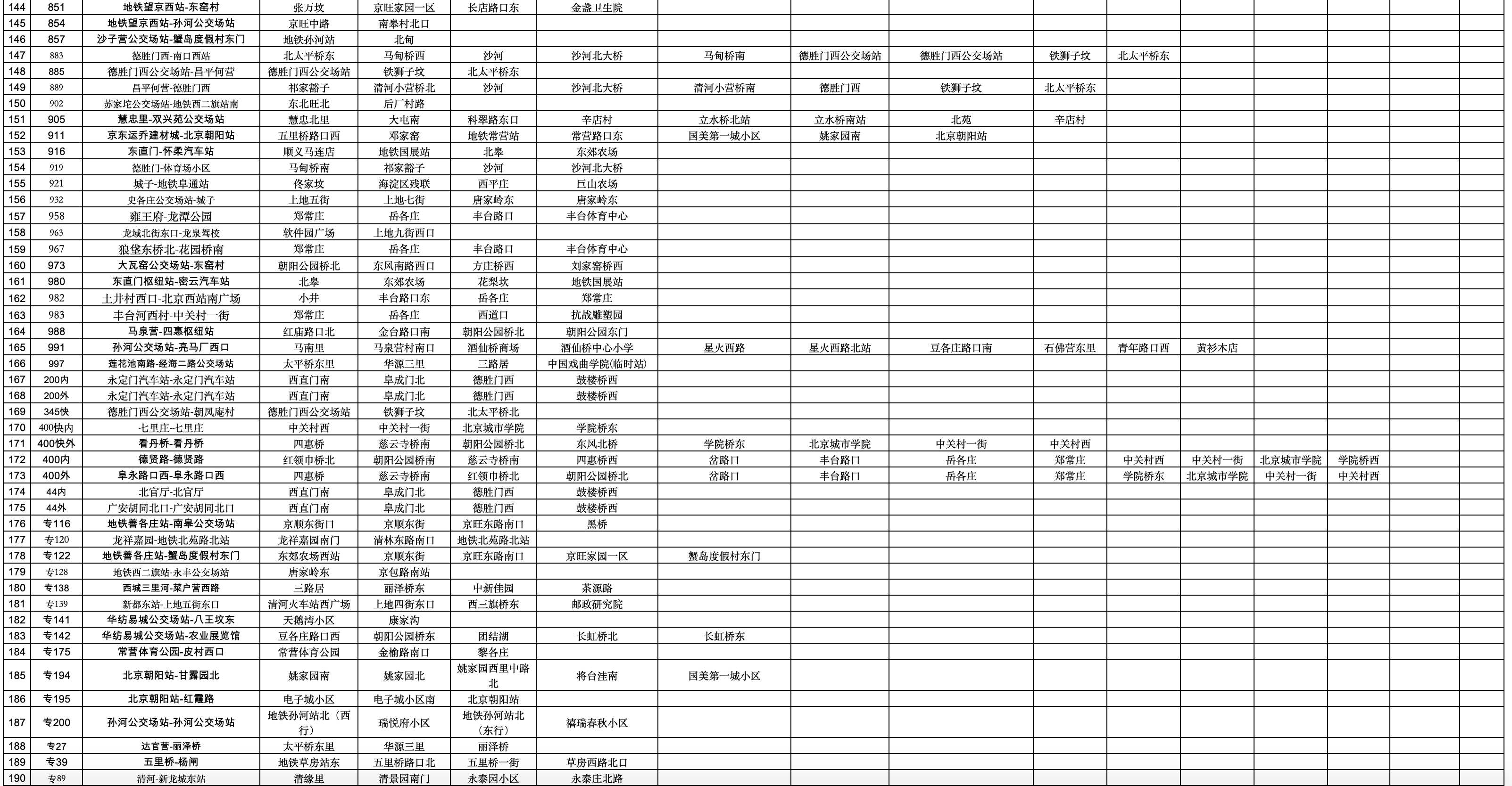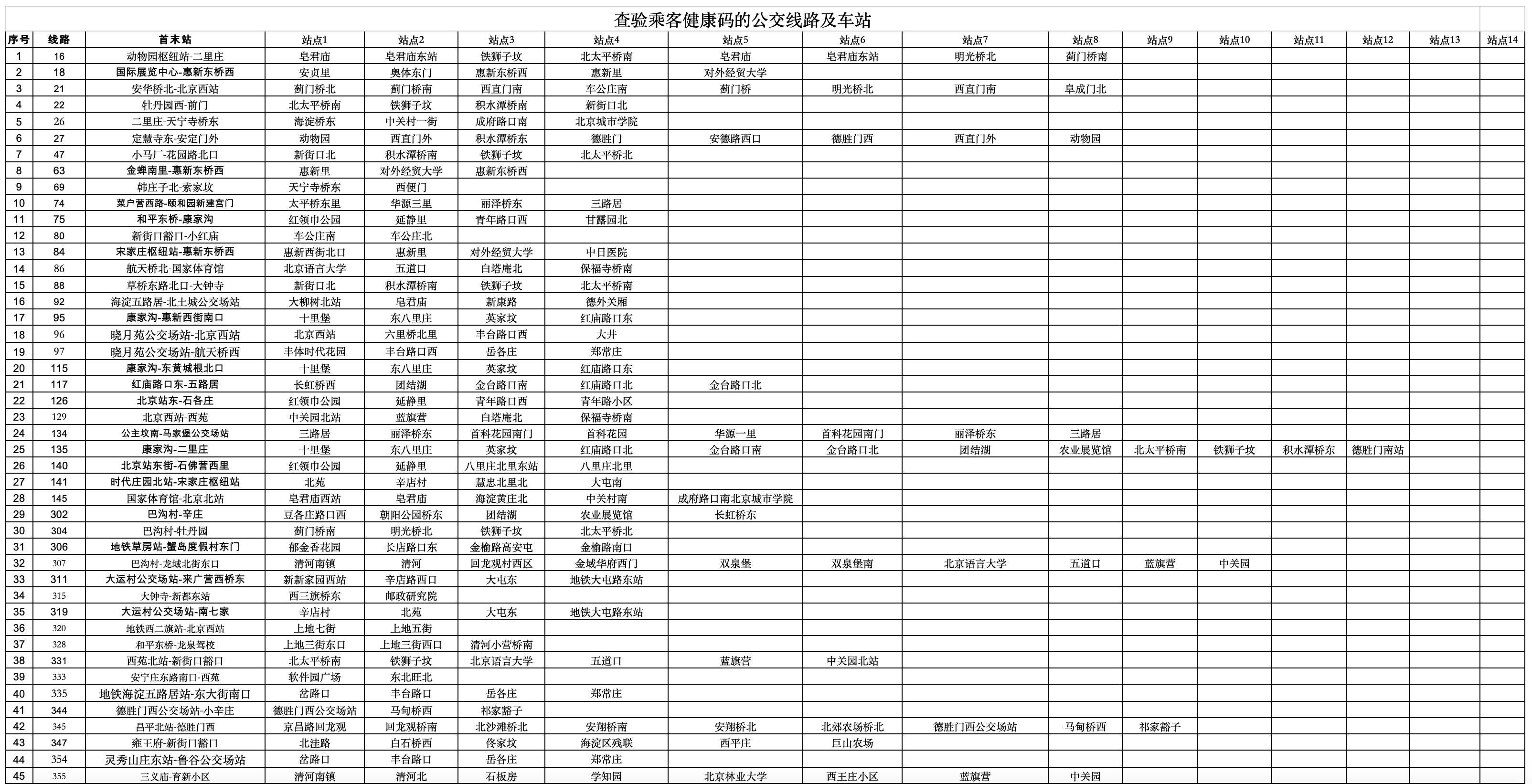 人民網(wǎng)北京5月16日電 (池夢蕊)根據(jù)北京市疫情防控需要,為做好精細精準防控,自2022年5月17日首班車起,北京市疫情防控封控區(qū)、管控區(qū)周邊的190條地面公交線路重點車站和54座地鐵車站(具體見附表),查驗乘客健康碼上車。后續(xù)將結(jié)合北京市疫情防控措施進行動態(tài)更新。