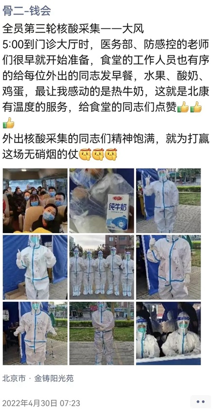 4月30日是五一小長假第一天,晚7點,宣武醫(yī)院神經(jīng)內(nèi)科電生理專業(yè)組工作群的消息突然響了,組長黃朝陽發(fā)布了一條信息:“5月1日和3日各需5人支援西城核酸采樣任務,請大家積極響應,積極報名!”看到醫(yī)院緊急通知,同事們用無聲、快速地接龍做出了回應,名額很快報滿,很多沒報上的同事還主動要求成為候補。