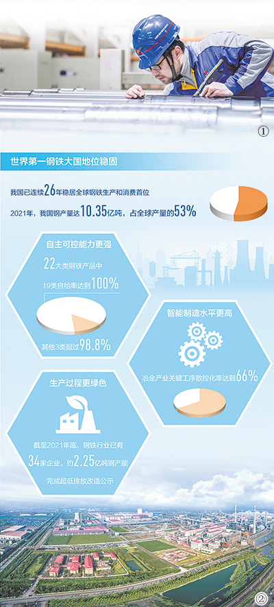 據(jù)中國(guó)鋼鐵工業(yè)協(xié)會(huì)統(tǒng)計(jì),與2012年相比,2021年,重點(diǎn)鋼鐵企業(yè)的平均噸鋼綜合能耗已由602.71千克標(biāo)煤降至550.43千克標(biāo)煤,與世界先進(jìn)水平的差距大幅縮小;噸鋼二氧化硫、煙粉塵的排放量降幅也分別達(dá)到了81.41%、63.44%。
