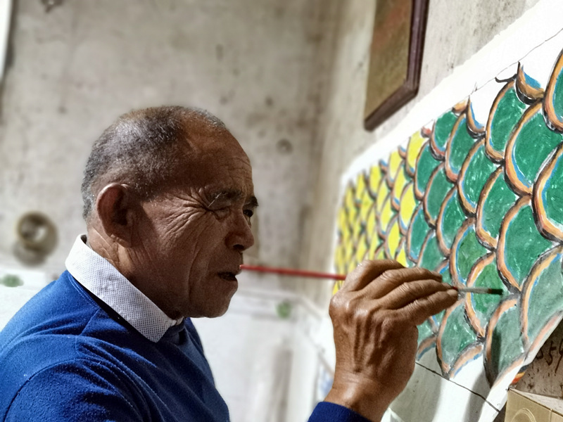 上完課,跟隨羅德書來(lái)到他的家里。只見(jiàn)畫好龍麒麟的油紙被當(dāng)成裝飾品掛在墻上,雨壇彩龍的半成品隨處可見(jiàn)。