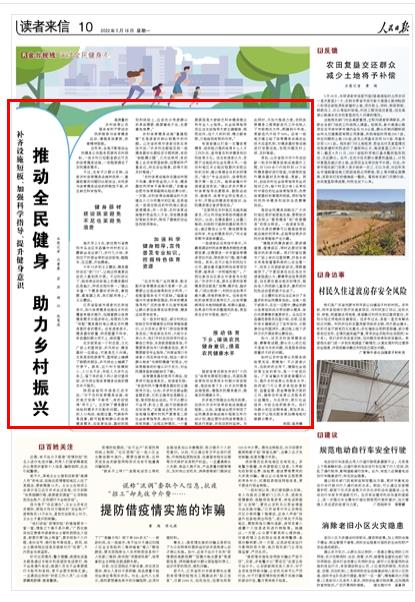推動全民健身戰(zhàn)略在廣大農村地區(qū)更好地落地實施,要幫助農民實現(xiàn)從“要我健身”到“我要健身”的觀念轉變。一些讀者發(fā)現(xiàn),舉辦優(yōu)質的賽事可以提高體育場地設施的利用率,還能帶動更多農民對體育鍛煉產生興趣。