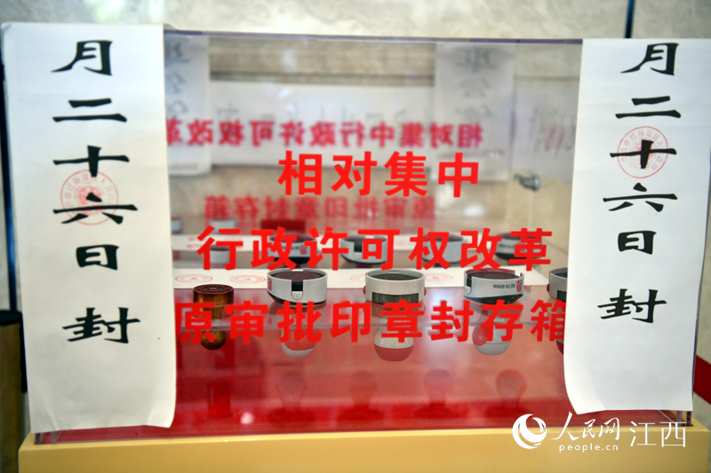 南昌紅谷灘區(qū)設立“難事直通車”專窗,優(yōu)化營商環(huán)境。圖為紅谷灘區(qū)行政審批局內展示封存的原審批印章。人民網(wǎng) 時雨攝