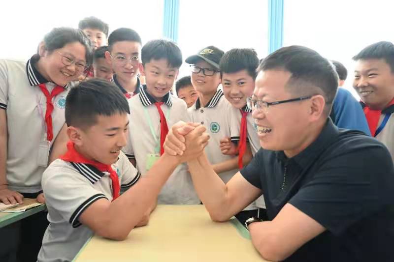 人民網(wǎng)莒縣5月26日電 5月26日上午,山東莒縣博雅實(shí)驗(yàn)學(xué)校校長(zhǎng)張迪洲(右)在課間同學(xué)生們一起玩掰手腕游戲,孩子們笑的很開(kāi)心。