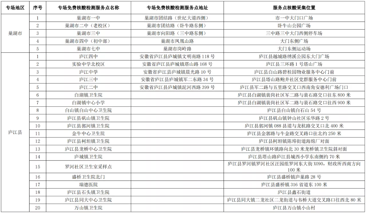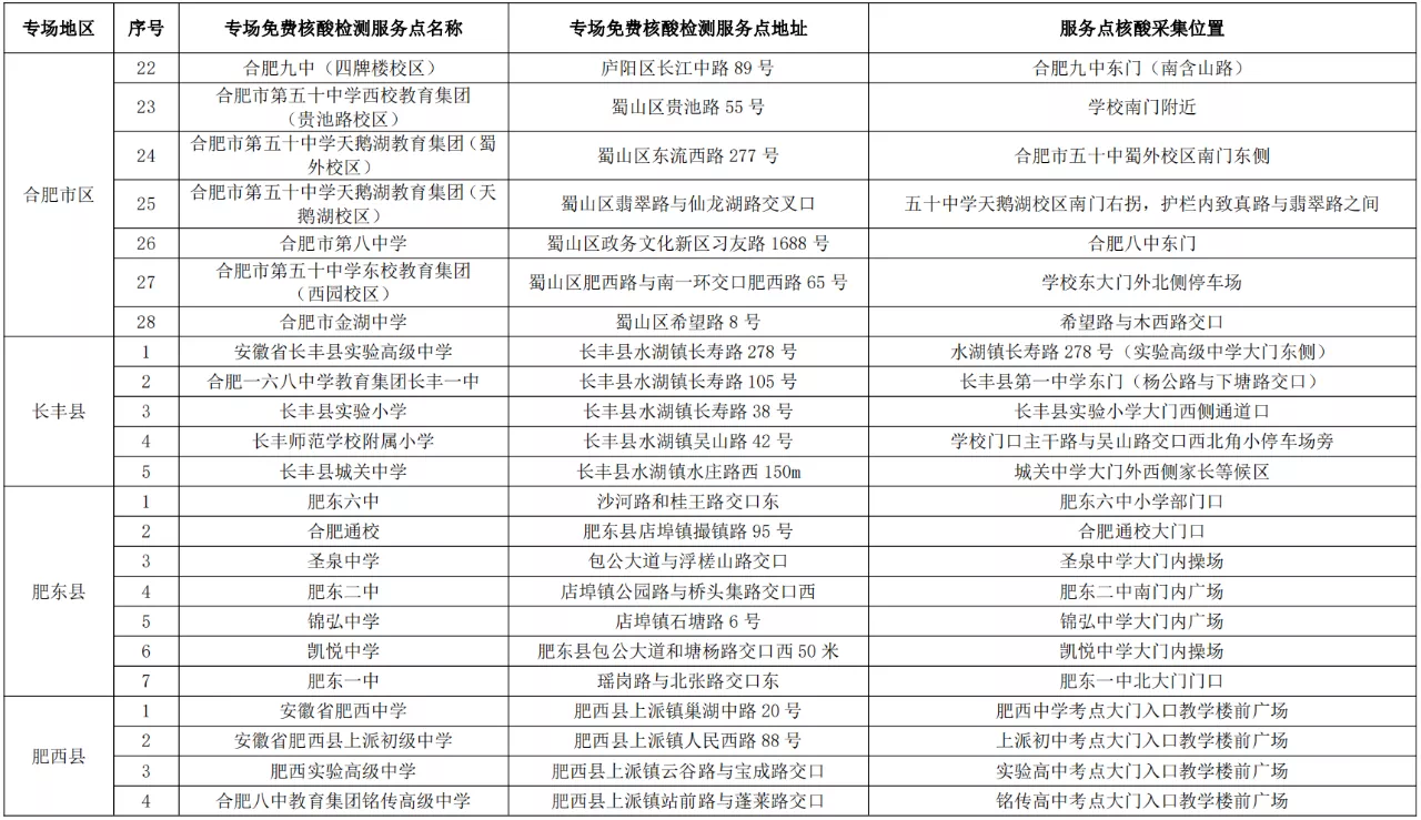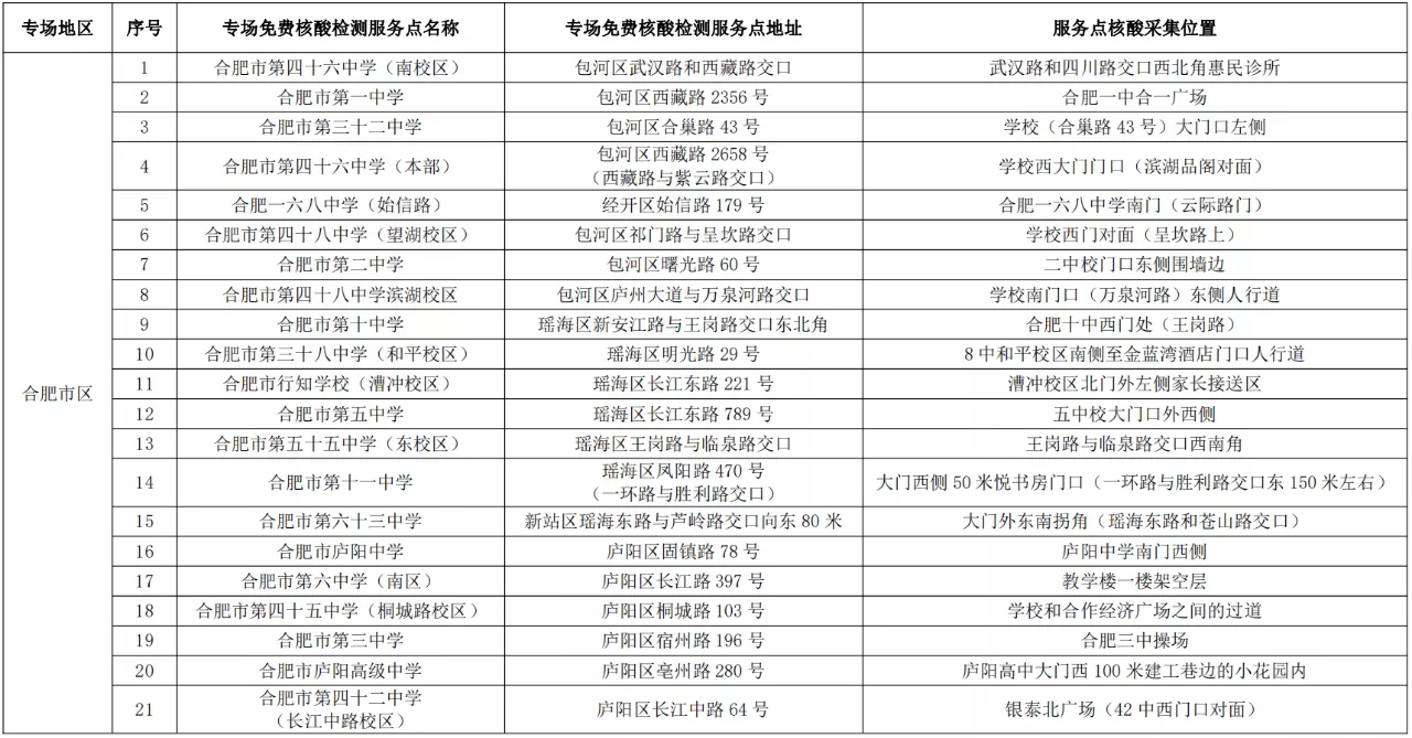 根據(jù)要求,各專場免費核酸檢測服務點僅對合肥市高考考生提供服務,考生可持準考證、安康碼就近到專場免費核酸檢測服務點進行核酸采樣,具體檢測點主要設在高考考點周邊。