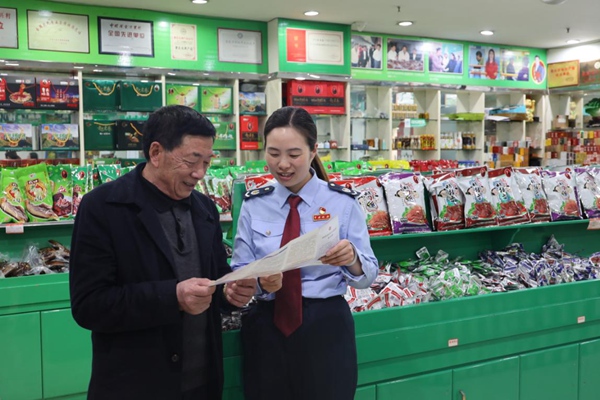 城口縣稅務(wù)人員為企業(yè)負責(zé)人講解新的組合式稅費支持政策。廖欣玥攝