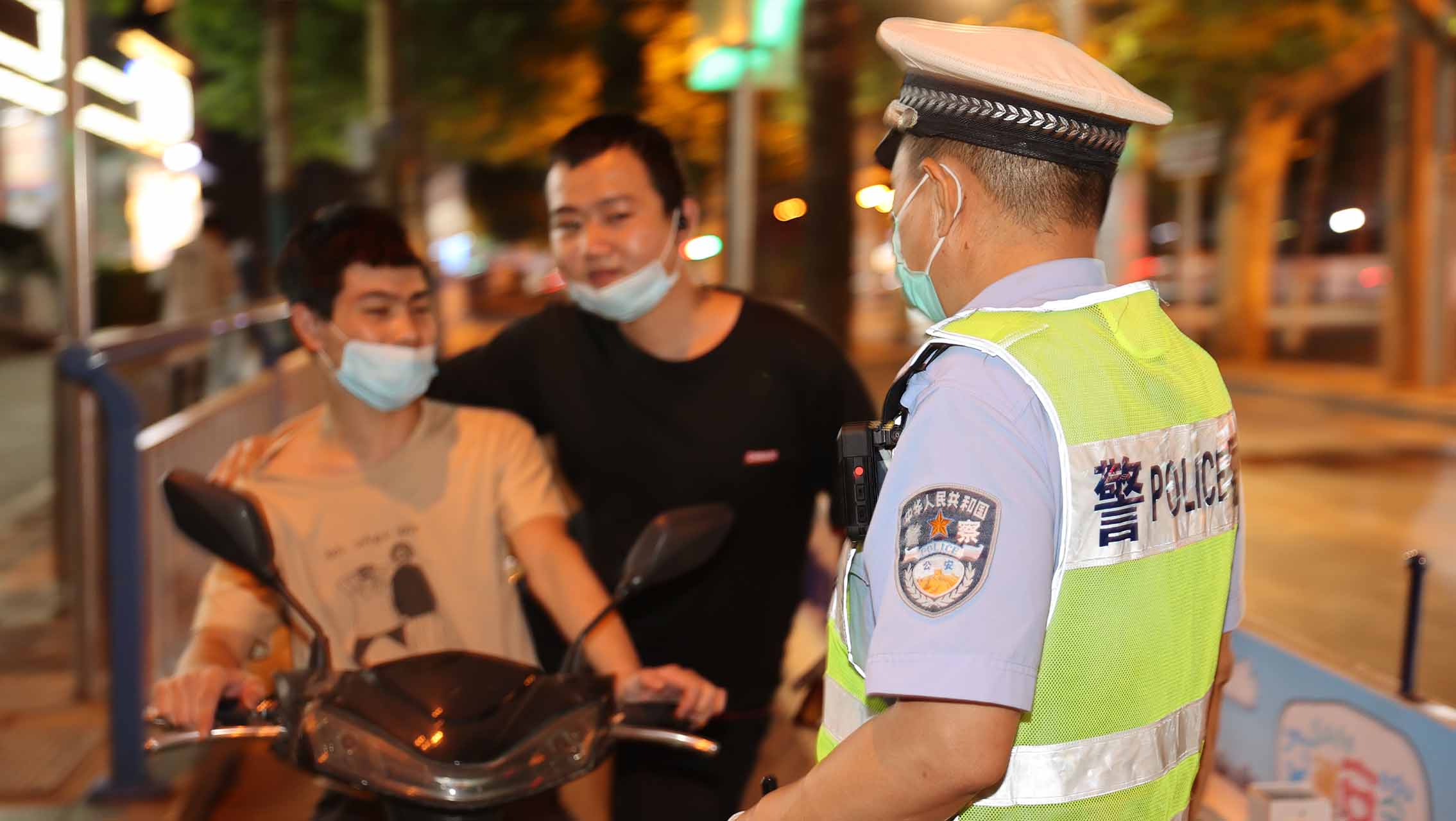 長安交警大隊民警在中山路青園街口勸導電動車騎乘人員佩戴安全頭盔。 王浩天攝