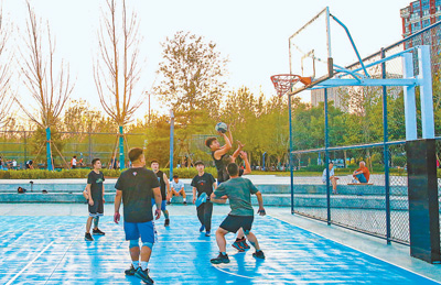 河北省石家莊市長安區(qū)拾光智慧體育公園里,市民正在打籃球。這座專業(yè)體育公園5月1日開放,以專業(yè)的運(yùn)動設(shè)施和優(yōu)美的健身環(huán)境,吸引眾多市民前來鍛煉。近年來,各地大力新建改建體育場地設(shè)施,為全民健身全面開展夯實基礎(chǔ)。