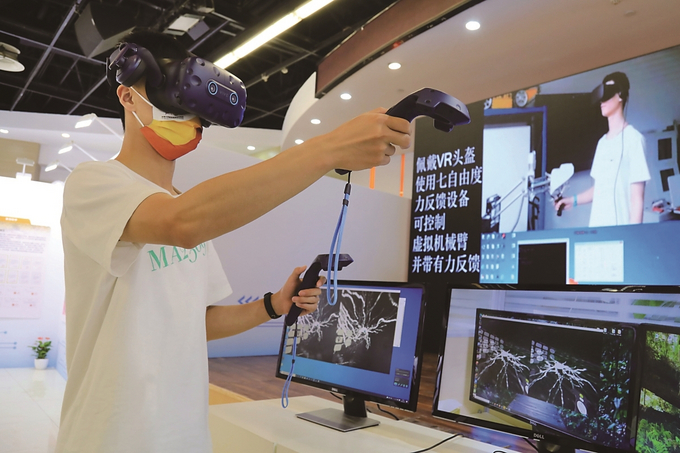 五月二十七日,東南大學舉辦“科學名世、人才報國”教學科研成果展,圖為現(xiàn)場展示的VR世界里操控虛擬機械臂。 本報記者 劉莉 攝