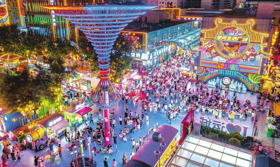 6月11日晚,市民在運(yùn)城市鹽湖區(qū)星河生活廣場消夏。鹽湖區(qū)升級改造后的星河生活廣場燈光璀璨、人流如織,人們紛紛前來打卡、購物消費。(閆鑫攝)