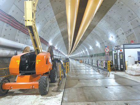 走進(jìn)項(xiàng)目工地,沒(méi)有想象中的機(jī)械轟鳴聲,施工現(xiàn)場(chǎng)位于幾十米深的地下。記者從地面乘坐直梯,順著盾構(gòu)機(jī)始發(fā)井,來(lái)到地下26米處的西線隧道內(nèi)。國(guó)產(chǎn)最大直徑泥水平衡盾構(gòu)機(jī)“京華號(hào)”,已在西線隧道里向前掘進(jìn)了近4000米。眼前的西線隧道,蜿蜒著向南延伸。開(kāi)工初期,記者從始發(fā)井步行幾分鐘即可抵達(dá)盾構(gòu)機(jī)駕駛艙位置;這次采訪,施工方特意安排了1輛純電動(dòng)代步車。“現(xiàn)在盾構(gòu)機(jī)離始發(fā)井有些遠(yuǎn),工作人員上下班都得坐車?!瘪{駛員說(shuō),這輛電動(dòng)代步車是用吊車吊到隧道內(nèi)的,還特意為它在隧道里安了充電樁,“這輛車再回到地面,就得是隧道貫通的時(shí)候啦!”