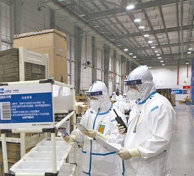 因為進口藥品的物流是冷鏈物流,按照嚴格的衛(wèi)生要求,我們換上白色防護服,戴上防護面屏、一次性手套、N95口罩,經過掃碼、測溫,一起進入了保稅倉。