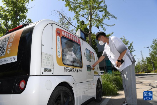 在雄安市民服務(wù)中心,市民在智能無(wú)人售賣(mài)車購(gòu)買(mǎi)飲料(2022年5月27日攝)。新華社記者 朱旭東 攝