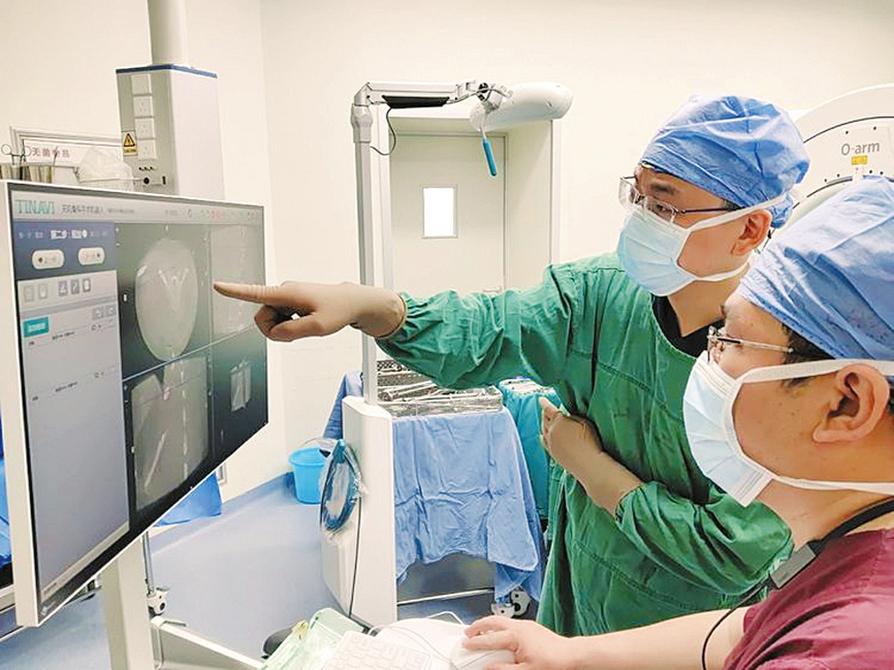 近日,山西醫(yī)科大學(xué)第二醫(yī)院趙斌教授、趙軼波副主任醫(yī)師團(tuán)隊(duì)完成省內(nèi)首例脊柱機(jī)器人導(dǎo)航可視化置釘手術(shù),耗時(shí)2小時(shí),出血量僅50毫升,患者術(shù)后恢復(fù)良好,第3天可下床活動。手術(shù)在機(jī)器人的輔助下,精準(zhǔn)有效置入椎弓根螺釘,縮短了手術(shù)時(shí)間,有效控制術(shù)中出血,顯著減少了放射線對醫(yī)生和患者的輻射,極大提高了手術(shù)效率和安全性。(周慧芳 高志國圖/文)